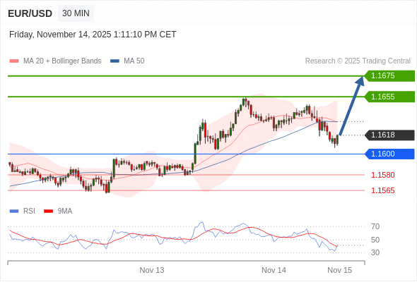 在 1.1600 之上,看涨,目标价位为 1.1655 ,然后为 1.1675 。