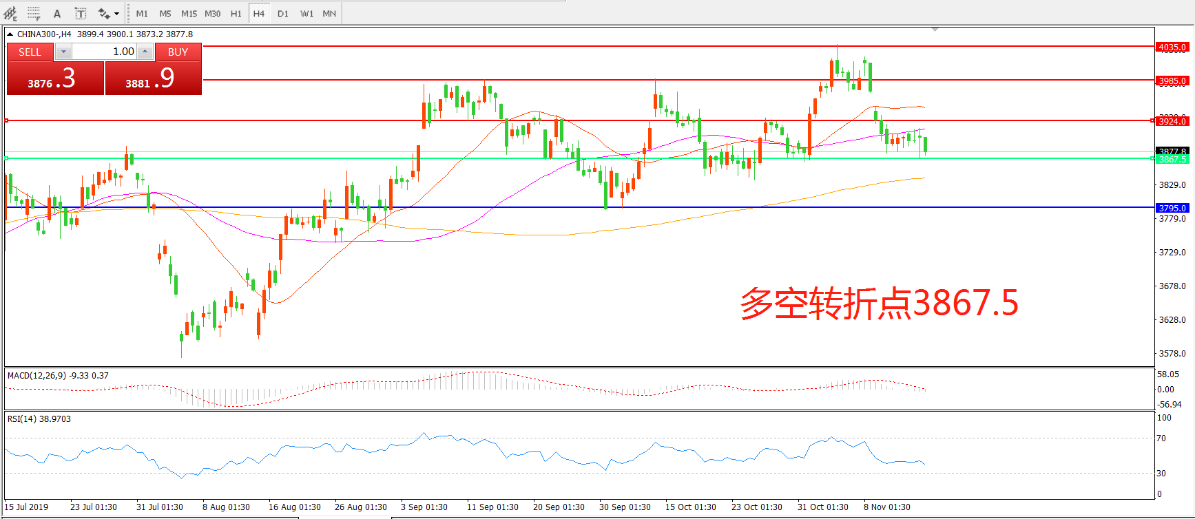 4小时图看,沪深300走势低迷,全天无明显反弹,3867.5成为短期支撑,3924成为上方阻力,均线系统走平,MACD红柱减少,RSI指标走平,日内有小幅反弹可能,但整体走势偏弱。