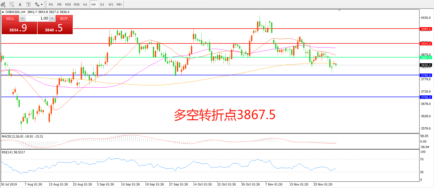 4小时图看,沪深300延续低位震荡,200周期均线被跌破,短期走势偏空中,MACD绿柱增加,RSI指标向下,日内延续下行概率较大。