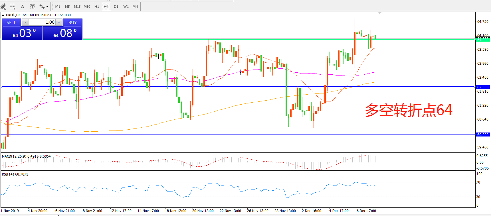 4小时图看,油价阳线连续拉升,一度突破64附近阻力,整体走势偏多,均线系统走平,MACD红柱增加,RSI指标走平,日内延续上行概率较大。