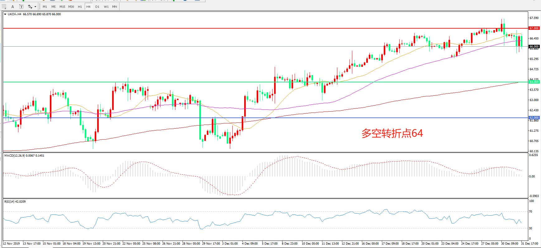 4小时图看,油价呈现高位震荡,67美元成为短线阻力,MACD红柱增加,RSI指标邹平,日内震荡上行概率较大。