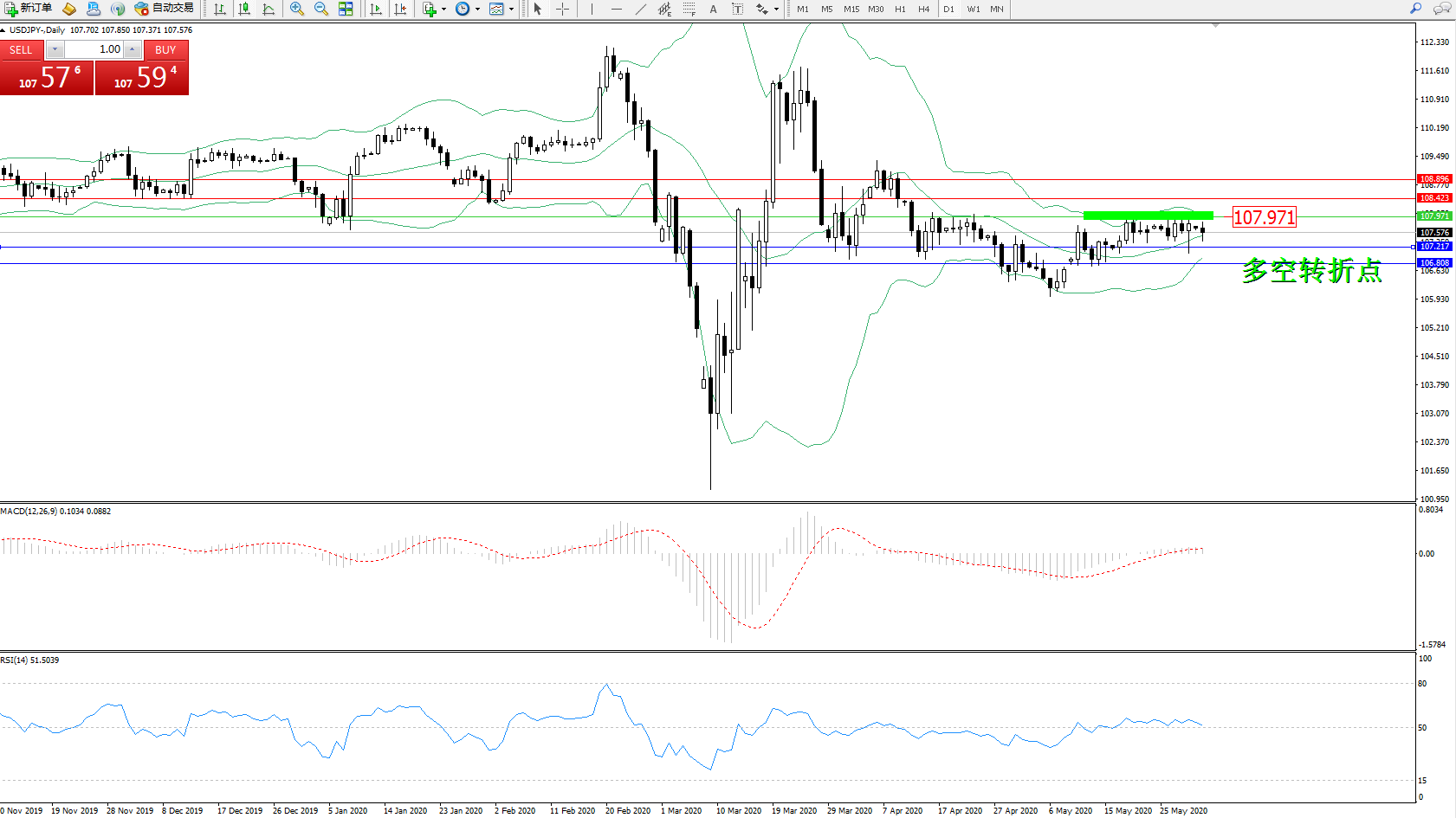 美元兑日元跌0.22%107.59,继续维持窄幅震荡状态,因近期美日央行政策有限,而风险偏好情绪也此起彼伏,充满不确定性,一方面,全球复工复产加快,股市走高,另一方面,国际地缘政治风险不减,支撑日元避险需求。市场对美国国内局势的担忧也影响了市场情绪,再加上还有贸易问题。近几日美国国内爆发了大规模抗议,为市场带来了极大的不确定性。受到疫情对经济的影响,全球各国央行都采取了极为宽松的货币政策,各国政府也都采用了各种刺激项目。