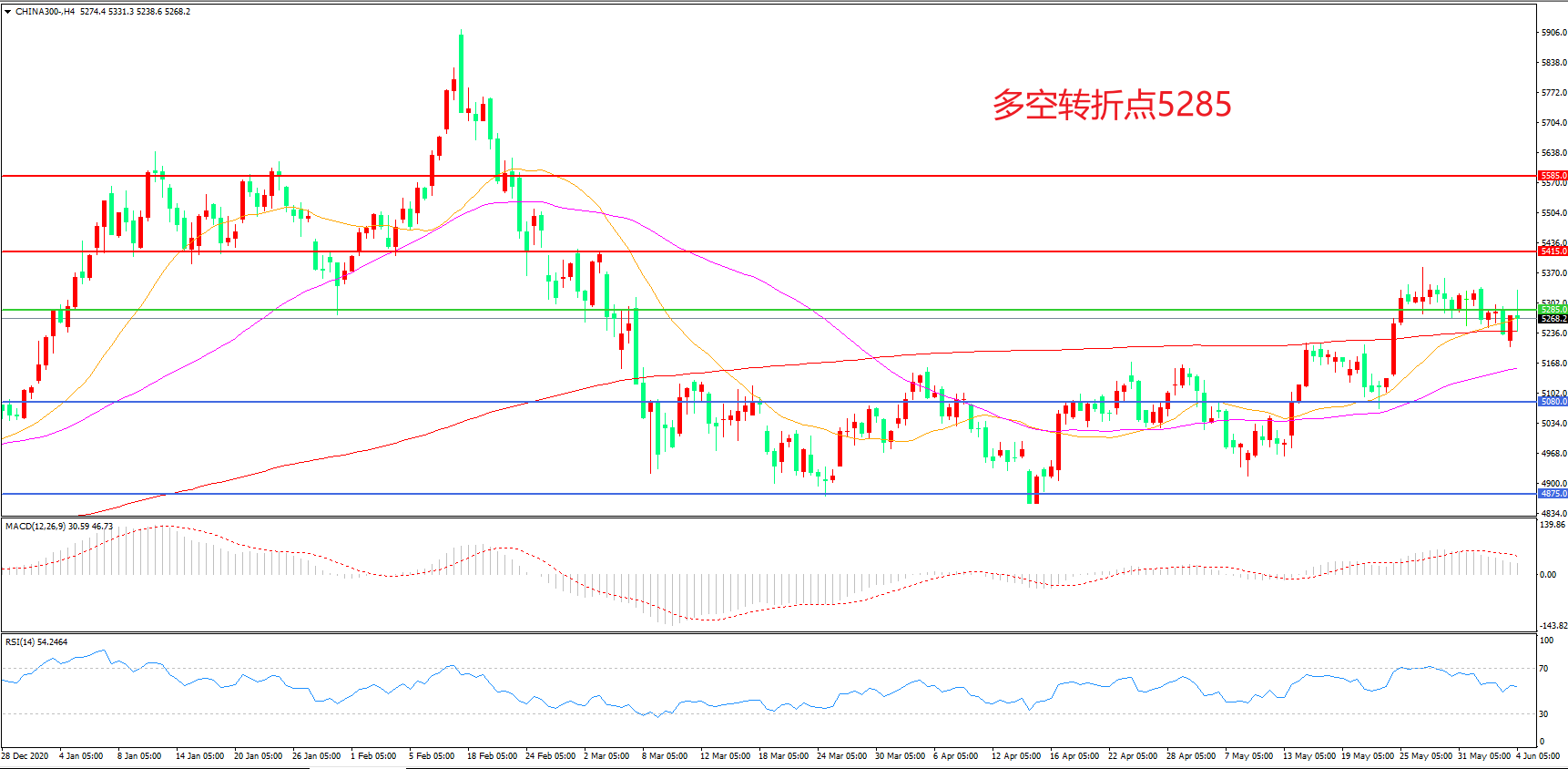 4小时图看,沪深300延续高位震荡,多空博弈较为均衡,5285成为多空分水岭,200周期均线成为下方支撑,MACD红柱缩短,RSI指标走平,日内延续震荡概率较大。
