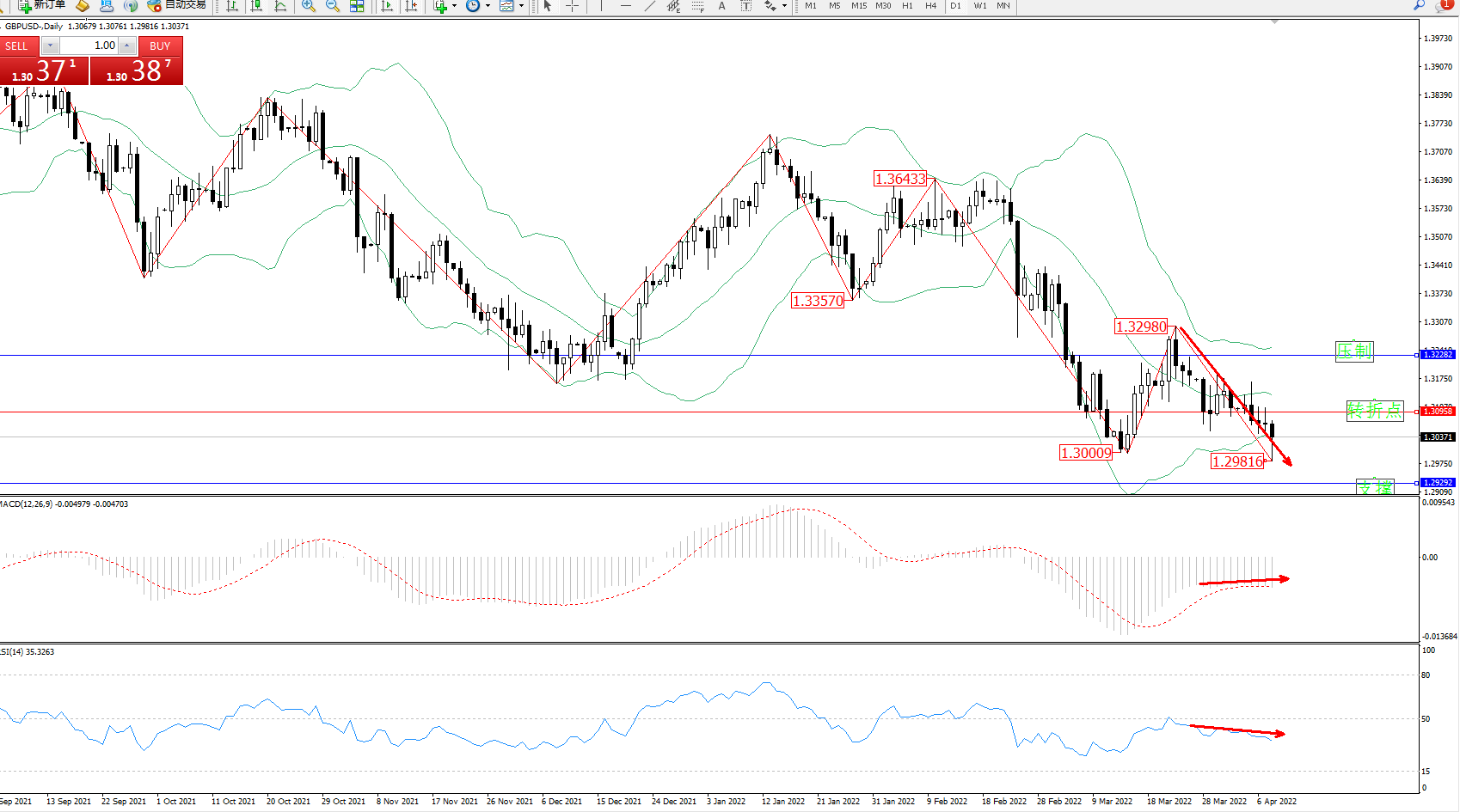空头动力延续布林带指标通道持续震荡下行,低位抵达1.30009位置后短暂震荡回升,但市场整体下行趋势态势良好,跌破之前低位至1.29816位置后震荡,短期空头动力有继续下行态势,布林带指标呈收口走势持续平移,上方压制关注1.32282附近,低位支撑关注1.29292附近,关注1.30958附近转折点,MACD指标处于空头区域维持整理平移,RSI指标处于空头区域维持整理缓慢下行中,如图: