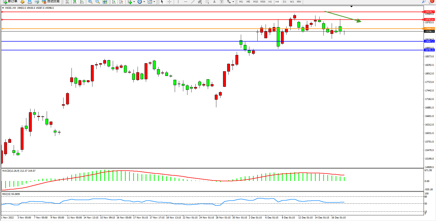 香港恒生指数12月19日(周一)收盘下跌97.86点,跌幅0.5%,报19352.81点;港股三大指数全线下跌,市场情绪低迷。恒指跌0.5%,国指跌跌0.45%,恒生科技指数跌0.58%。大型科技股涨跌不一,小米跌1.8%,百度跌1.24%,美团、腾讯小幅走强;前期反复活跃的抗疫概念股集体下挫,国务院鼓励社会力量提供多样化教育服务,教育股在弱势中表现尤为亮眼,细价股光正集团飙涨逾52%领衔;南下资金净流入14.66亿港元,大市成交额为1006亿港元。