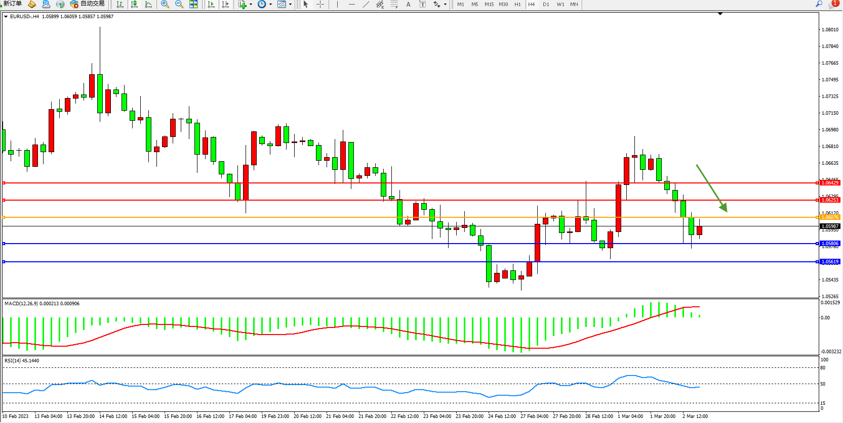 欧元美元EURUSD—4小时K线图显示: