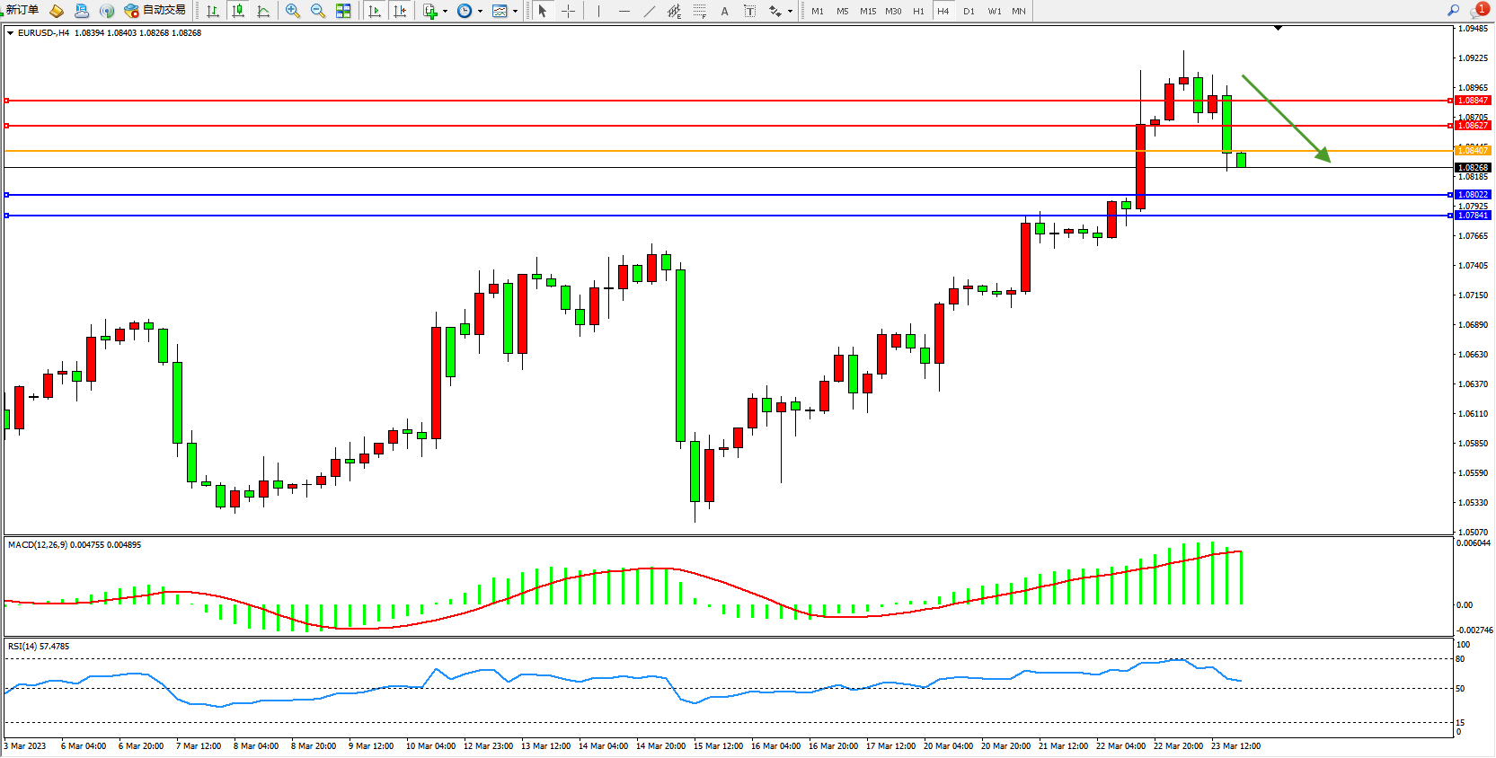 欧元美元EURUSD—4小时K线图显示: