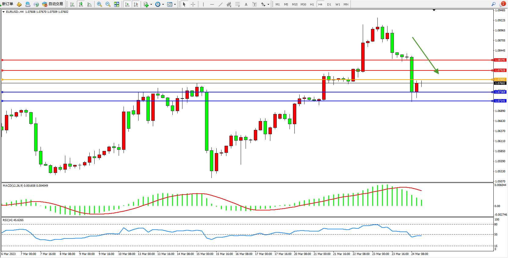 交易策略:1.07692下方看跌,目标1.07369 1.07141