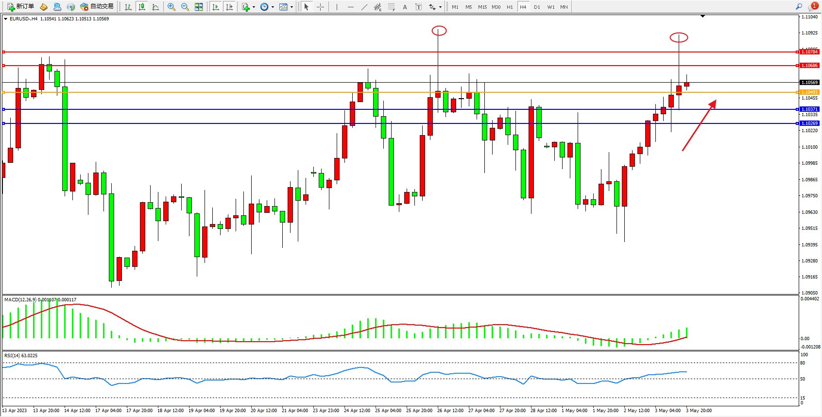 欧元美元EURUSD—4小时K线图显示: